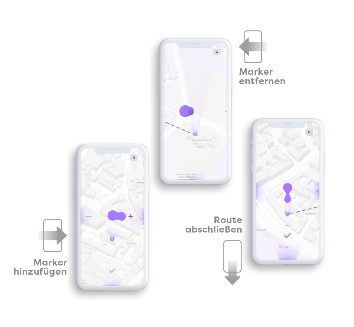Der Marker ist das Hauptinteraktionselement des Systems. Anhand seines Aussehens und Verhaltens signalisiert er verschiedene Zustände. Dabei reagiert er auf das Verhalten der Nutzer*innen und passt sich der aktuellen Situation an. So nimmt er sich zurück, sobald auf der Karte gescrollt wird oder wird lebendig und zeigt eine mögliche Bedienung an.