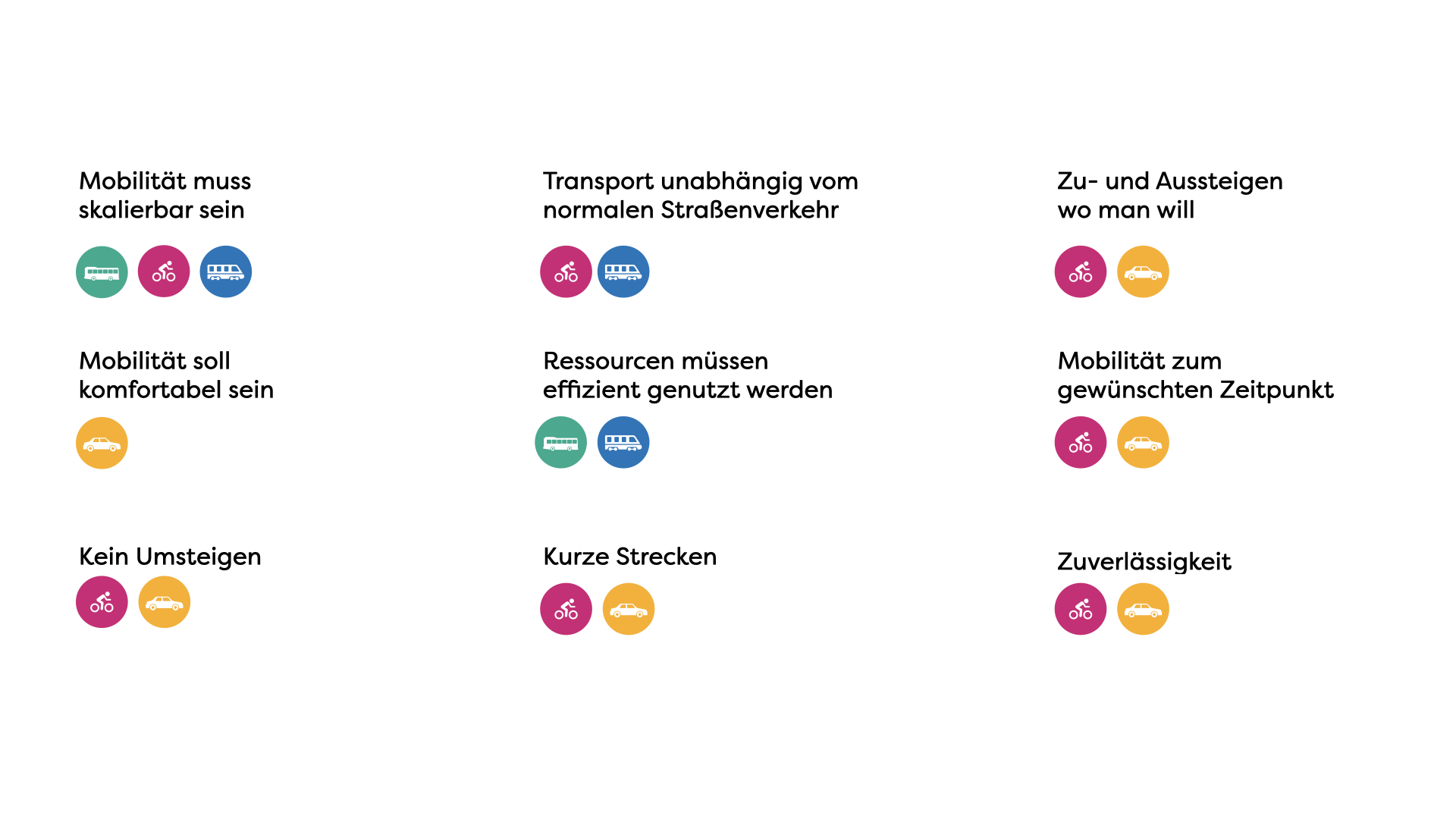 Die Nutzer*innen benötigen ein Verkehrsmittel, mit dem sie flexibel und häufig zu verschiedenen Punkten fahren können, ohne lange Wartezeiten. Dabei sollte Mobilität jeder Zeit und an jedem Ort zur Verfügung stehen. Je kürzer und direkter die Fahrt, desto besser.